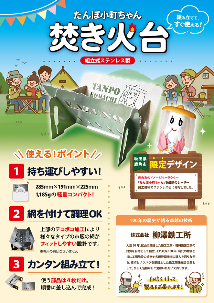 【ふるさと納税】たんぽ小町ちゃん「焚き火台」 投稿日 2025年2月17日 更新日 2025年11月28日 著者 伊東和史 カテゴリー ニュースリリース 鹿角市のふるさと納税サイトで間もなくリリースされます当社製作の焚き火台。 リーフレットを制作いたしましたのでご紹介します。