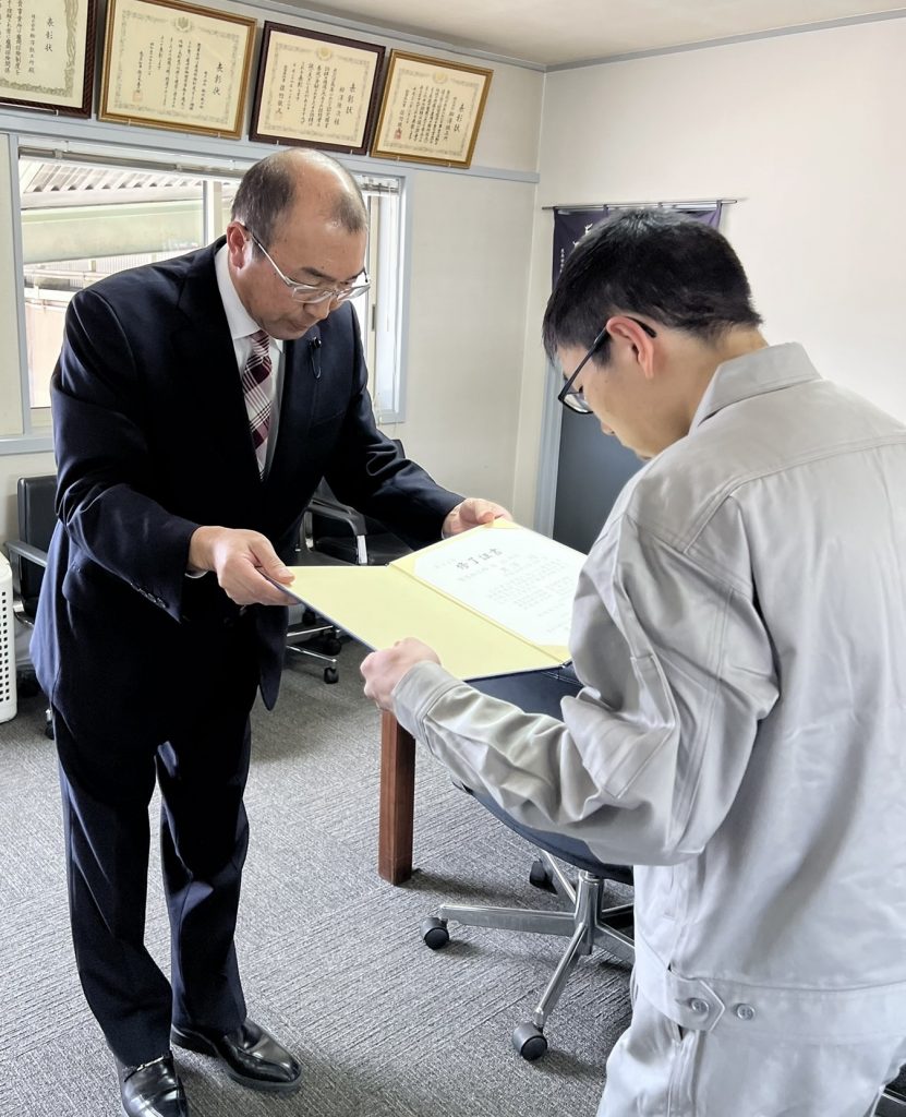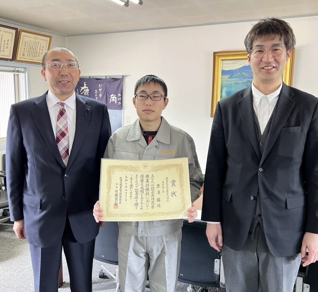 当社社員黒澤が、鹿角共同高等職業訓練校における2年間の課程を無事修了し、本日、修了証を授与されました。授与式には鹿角地方職業能力開発協会長児玉政明様にご来社いただき、直接お渡しいただきました。さらに、黒澤は成績優秀者として表彰され、記念品と賞状をいただきました。この栄誉を励みに、今後一層の活躍を期待しております。