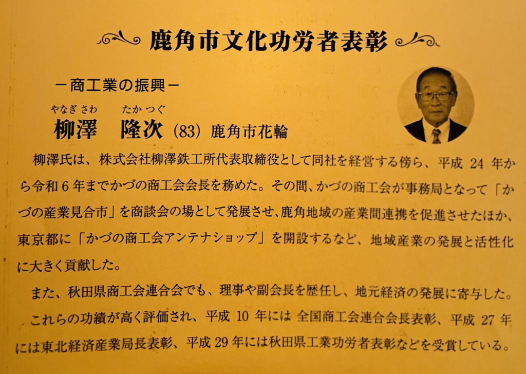 本日弊社会長の柳澤隆次が鹿角市文化功労者表彰を受けました